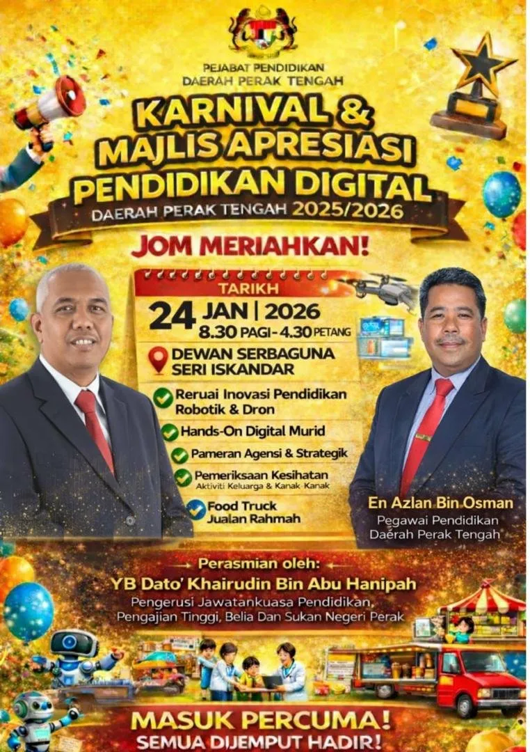 Pejabat Pendidikan Daerah Perak Tengah telah menganjurkan Karnival & Majlis Apresiasi Pendidikan Digital Daerah Perak Tengah 2025/2026 pada 24 Januari 2026 bertempat di Dewan Serbaguna Seri Iskandar. Program yang berlangsung dari jam 8.30 pagi hingga 4.30 petang ini dirasmikan oleh YB Dato' Khairudin Bin Abu Hanipah, Pengerusi Jawatankuasa Pendidikan, Pengajian Tinggi, Belia Dan Sukan Negeri Perak.